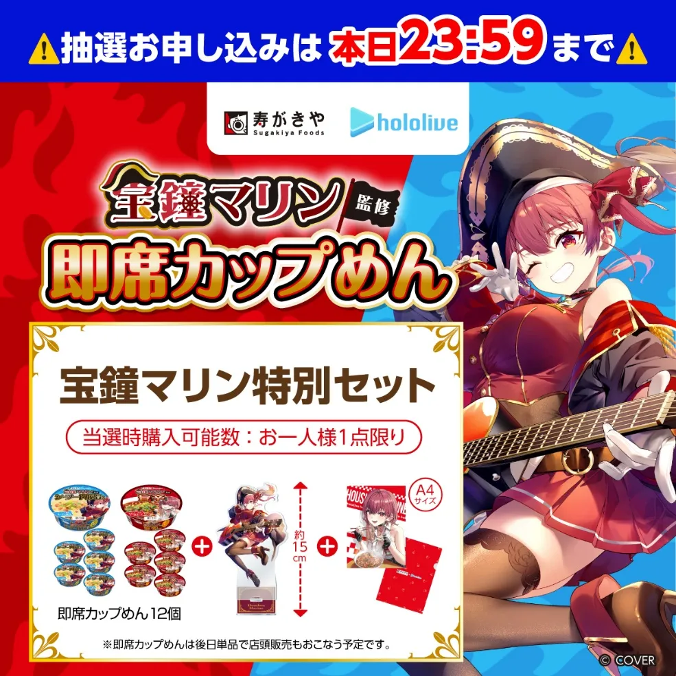 So this time, it’s a dream collaboration between hololive member Houshou Marine-chan and the Japanese cup noodle maker Sugakiya! Not only does it feature a special edition package, but the Captain herself supervised and designed the flavor—a super luxurious cup noodle now available through a lottery sale!