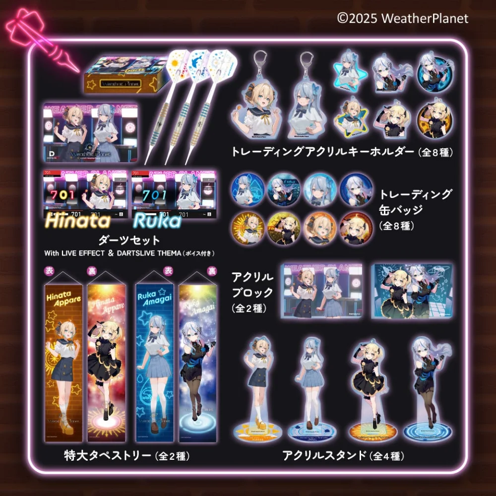 This collaboration is between the darts specialty store ‘Darts Hive’ and the two-person VTuber unit ‘Weather Planet’! This collaboration came to life to bring darts to more people and make it more fun, and a special Weather Planet appears as goods!
