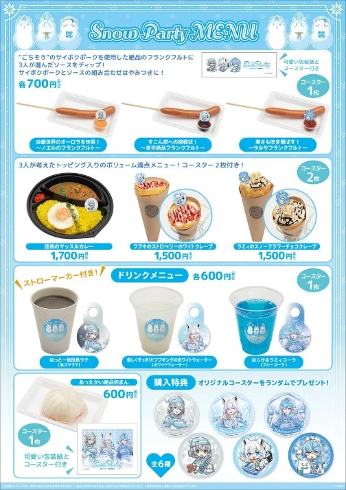 When you visit Sayama Ski Resort, three hololive members—‘Shirakami Fubuki,’ ‘Shirogane Noel,’ and ‘Yukihana Lamy’—welcome you in winter outfits equipped with ski wear and goggles! Large photos of them are displayed throughout the venue, and there are also collaboration foods, a collaboration room, and limited collaboration goods available only during this period!